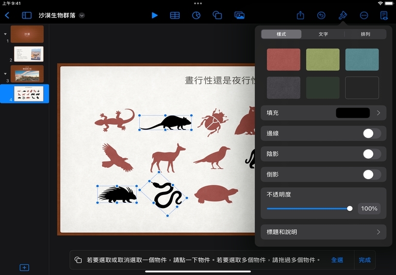 一次設定多個形狀的格式。點一下形狀,然後從選單中選擇「選取物件」。點一下其他形狀以進行選取,然後點一下「完成」。使用「格式」工具,同時變更所有已選形狀的外觀。