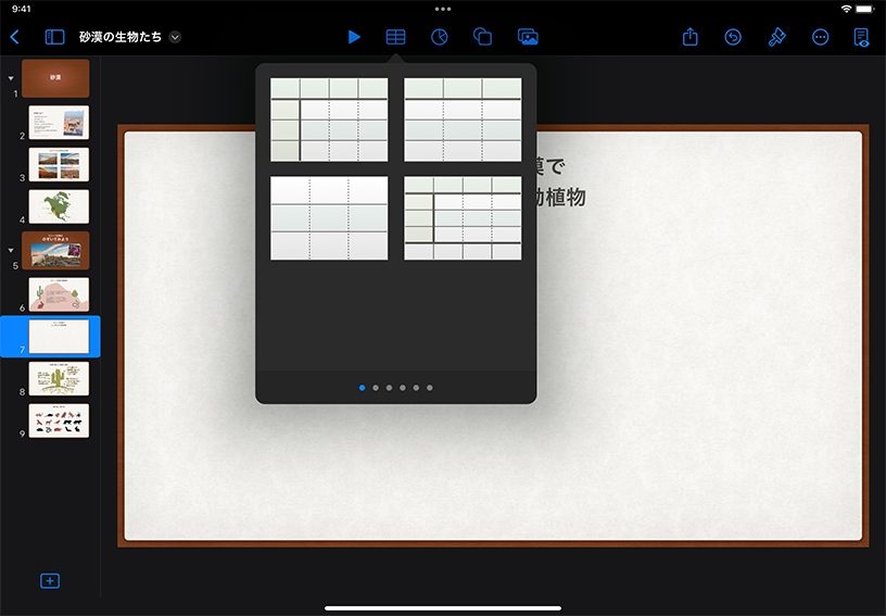 左右にスワイプして、あらかじめ用意されている表の種類を確認したあと、使用するレイアウト(ヘッダ行、ヘッダ列、フッタ行の有無)を1つ選びます。