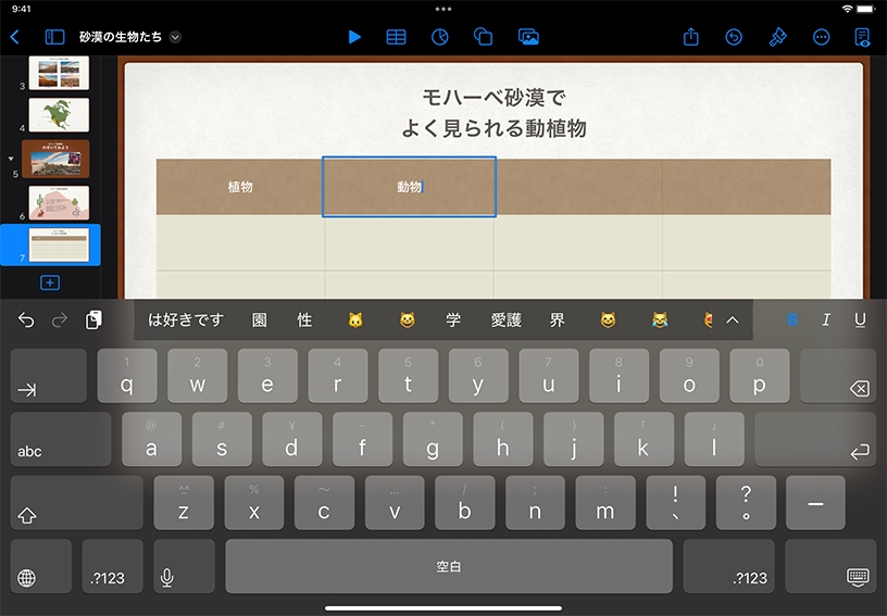 テキストや数字を入力してみましょう。セルをダブルタップして入力したら、別のセルもタップして、編集してみましょう。編集が終わったら、キーボード非表示ボタンをタップします。