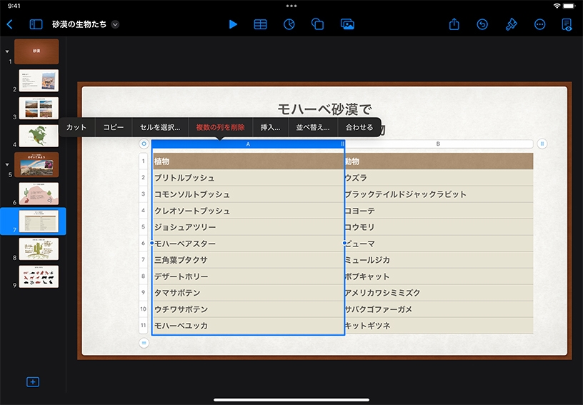 行全体または列全体を変更してみましょう。列の一番上に表示されている文字か、行の左端に表示されている数字をタップすると、「並べ替え」や「列を削除」などのメニューが表示されます。