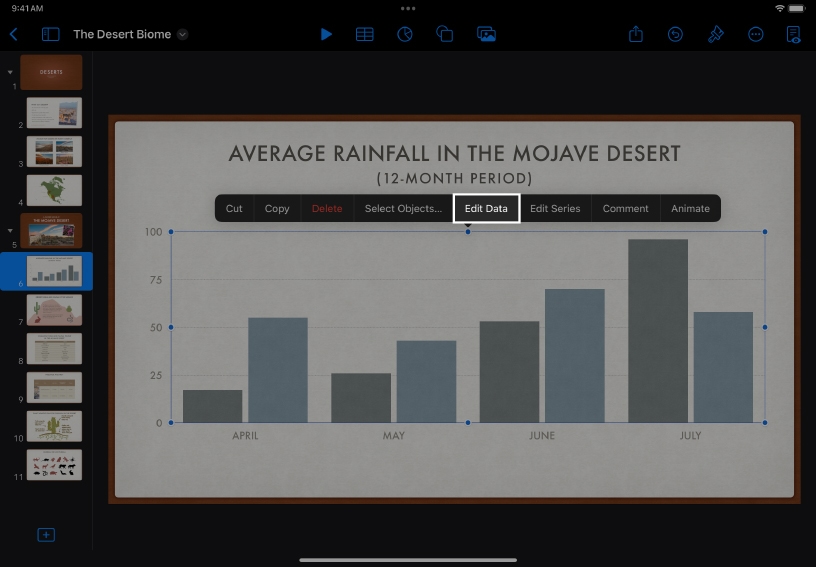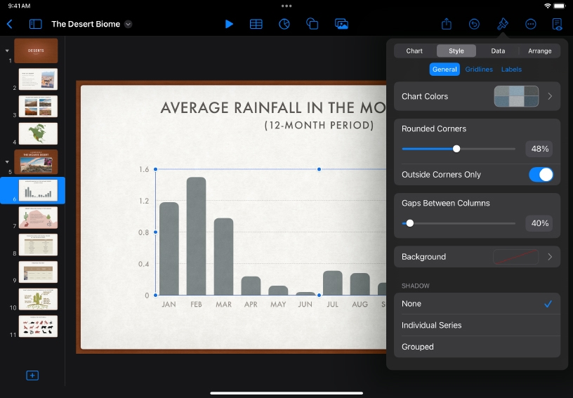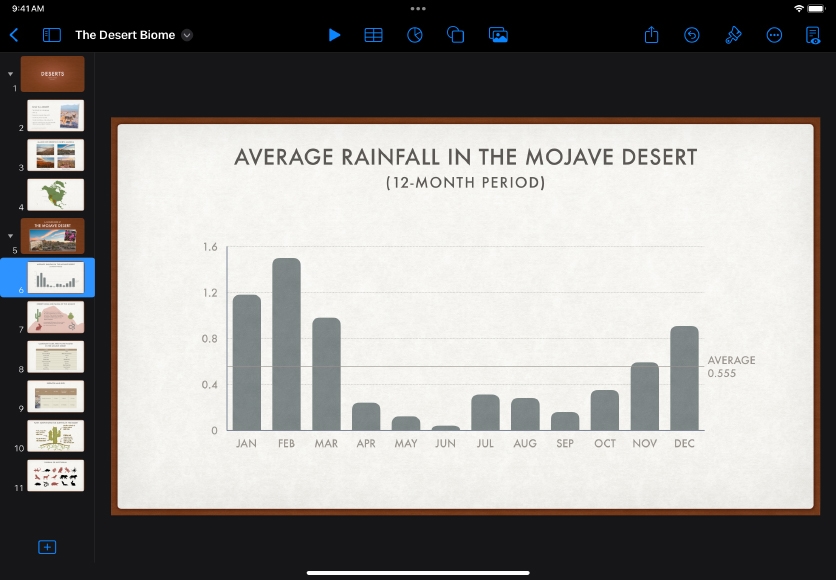 Keynote includes a variety of chart types for turning any set of data into expressive visuals. Explore how different chart types work better for certain kinds of data, such as line charts for changes over time or stacked columns for changes in composition.
