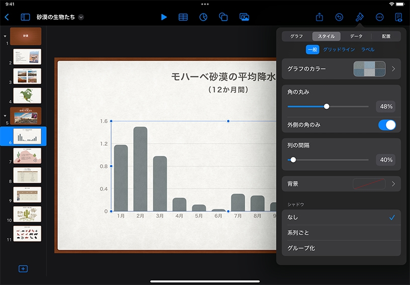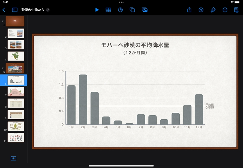 Keynoteには様々な種類のグラフが用意されているため、どんなデータも視覚化して印象的に表現できます。異なる種類のグラフを比較して、どのグラフがどのようなデータに適しているのか考えてみましょう。例えば、時系列で変化を表すには折れ線グラフ、内訳の変化を表すには積み重ね縦棒グラフが適しています。