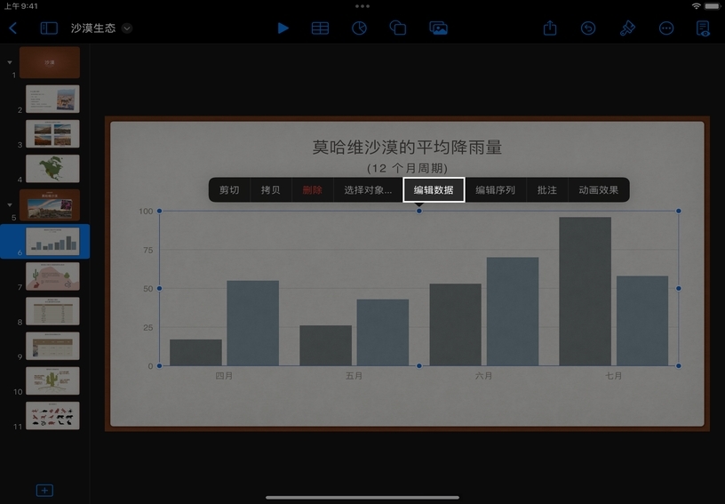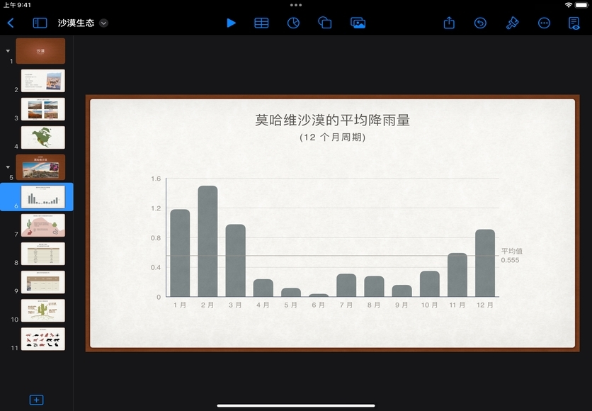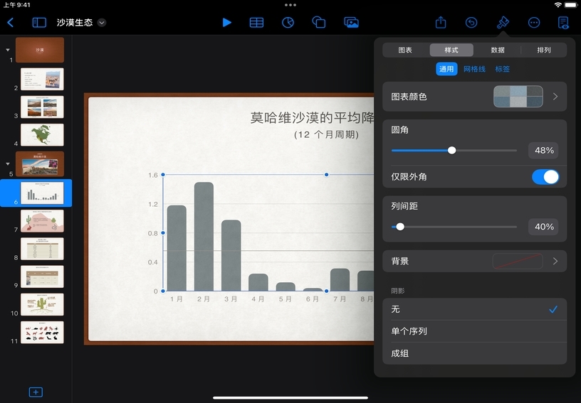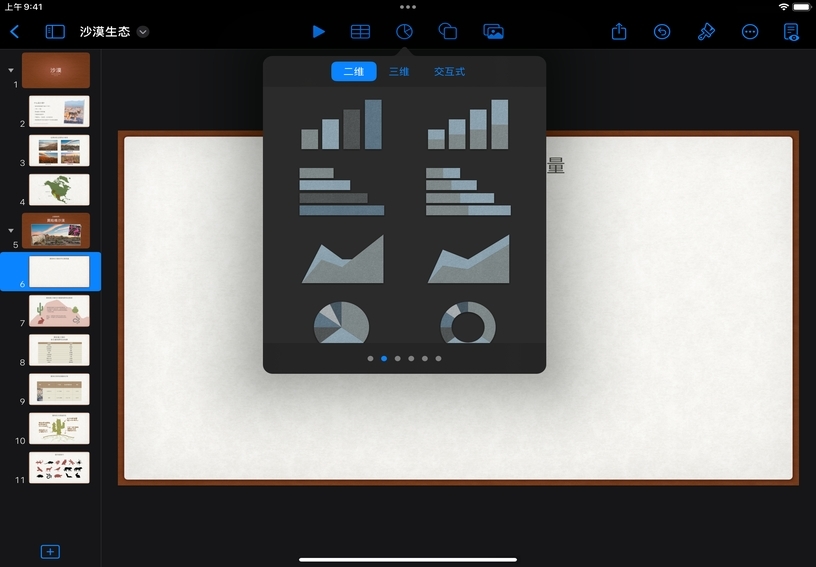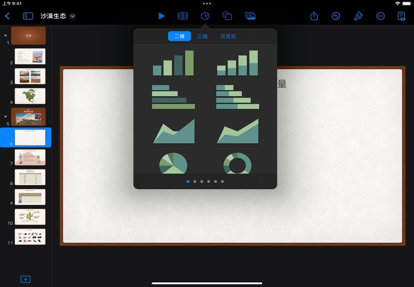Keynote 讲演提供了多种类型的图表,可以将任意一组数据转换为生动直观的视觉元素。探索不同类型的图表如何更适配特定类型的数据呈现,例如,折线图适合展示随时间变化的情况,堆叠柱形图则适用于呈现成分构成的变化。