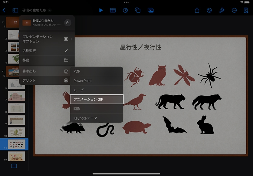 マジックムーブを使ってシンプルな一連のアニメーションを作成し、スライドをGIF(ループ再生される短いアニメーション)として書き出すこともできます。作成したアニメーションGIFは写真ライブラリに保存でき、Eメールやメッセージで送信することも、Pagesのドキュメントに挿入することもできます。
