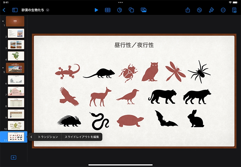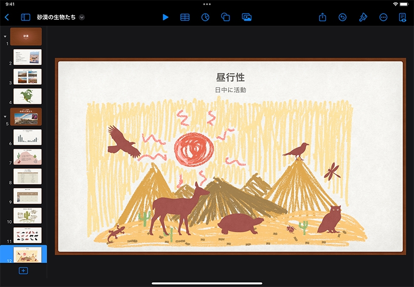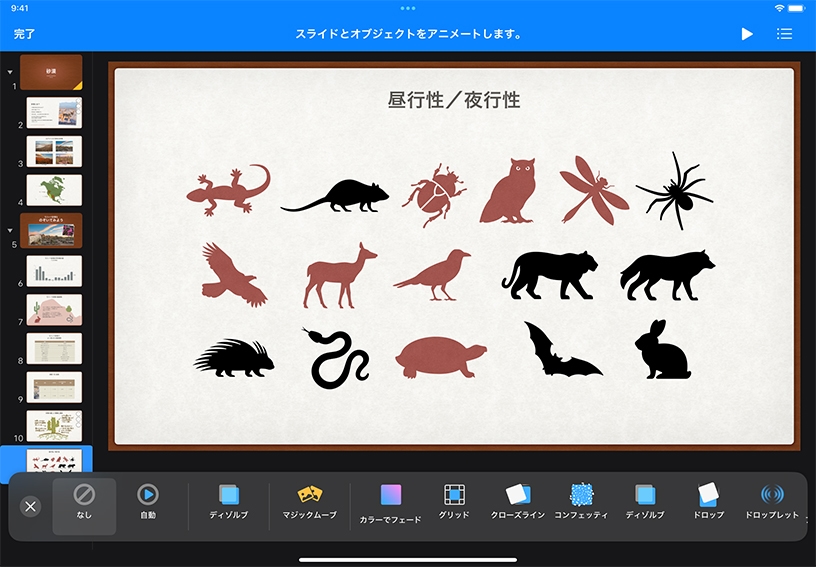 元のスライドに戻り、再生ボタンをタップしてからスライドをタップすると、アニメーションを再生できます。