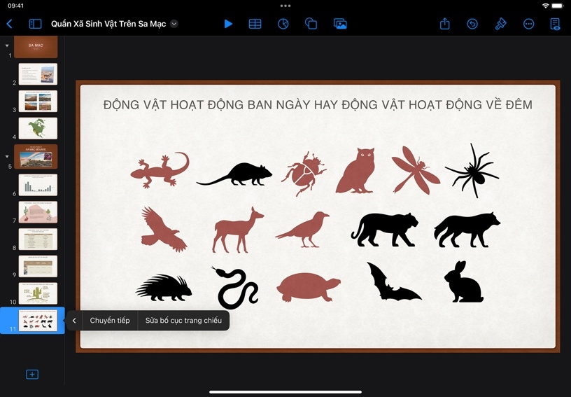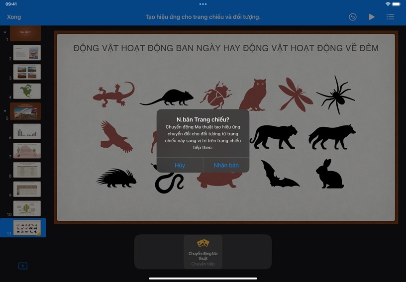Chuyển Động Ma Thuật là một hiệu ứng chuyển tiếp thú vị để di chuyển, thay đổi kích thước và xoay đối tượng giữa các trang chiếu. Căng buồm chiếc tàu đi khắp thế giới, tái hiện diễn biến trong bối cảnh văn học, hoặc sắp xếp lại các phân tử trong một phản ứng hóa học.