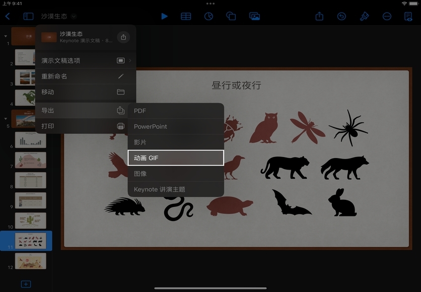 使用“神奇移动”,可创建出简单的动画序列,然后将幻灯片导出为 GIF (简短循环播放的动画)。你可以将 GIF 动画存储到照片图库,通过电子邮件或信息进行发送,也可插入到 Pages 文稿中。