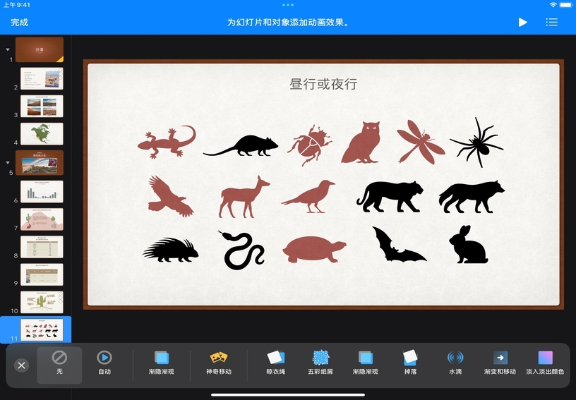 添加“神奇移动”过渡效果。在幻灯片导航器中轻点以选择幻灯片缩略图。轻点“过渡”,然后轻点屏幕底部的“添加过渡”。