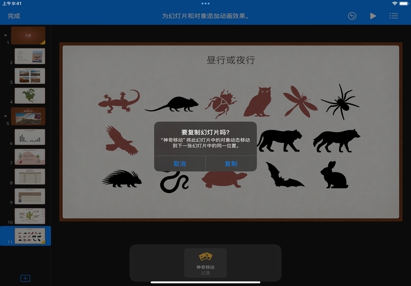 在出现的窗口中,轻点“复制”以复制当前幻灯片。