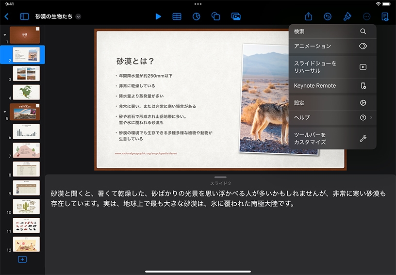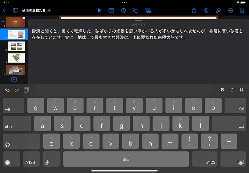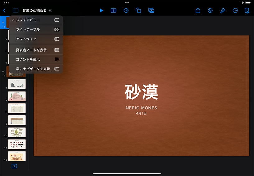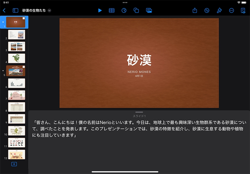 iPadを使ってプレゼンテーションをしてみましょう。プレゼンテーションで最初に表示するスライドをタップし、再生ボタンをタップします。タップまたはスワイプでスライドを進めることができます。