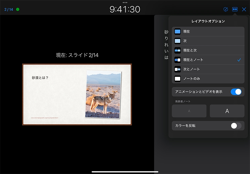 レイアウトを変更してみましょう。レイアウトボタン>「現在とノート」の順にタップすると、現在のスライドと発表者ノートを並べて表示することができます。リハーサルを終了するには、閉じるボタン