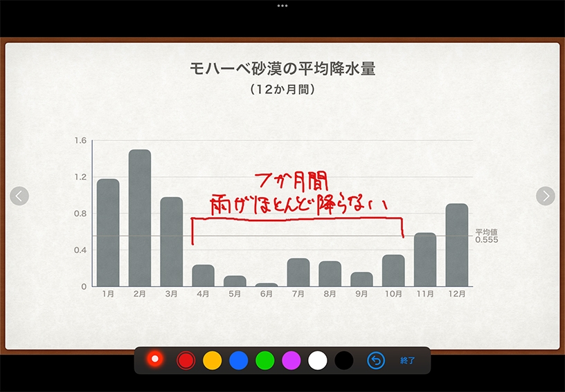 プレゼンテーションをしながら、スライドにイラストを描いてみましょう。スライドの上で長押しすると、描画ツールが表示されるので、色を選び、スライドに表示されているキーワードや重要な部分を指でハイライトしてみてください。