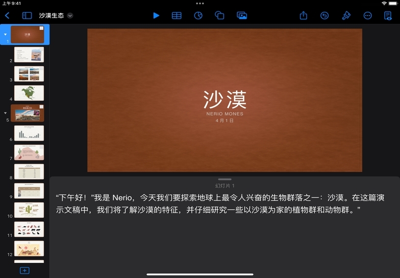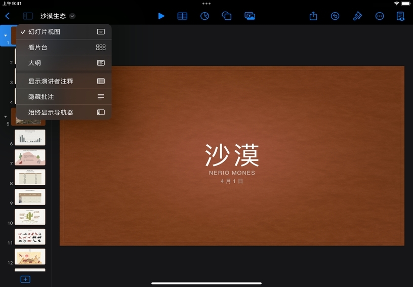 在 iPad 上演示。轻点想要开始演示的幻灯片,然后轻点“播放”