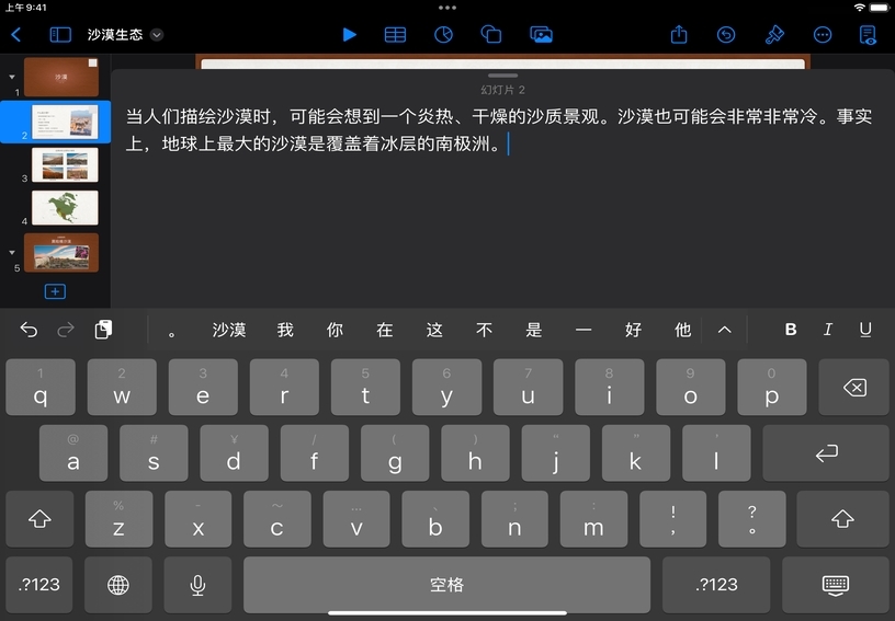 在幻灯片导航器中轻点一张幻灯片,然后在幻灯片下方的演讲者注释区域中输入你的注释。完成后,轻点“隐藏键盘”