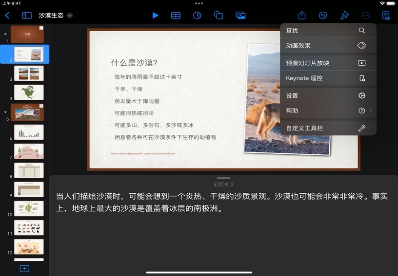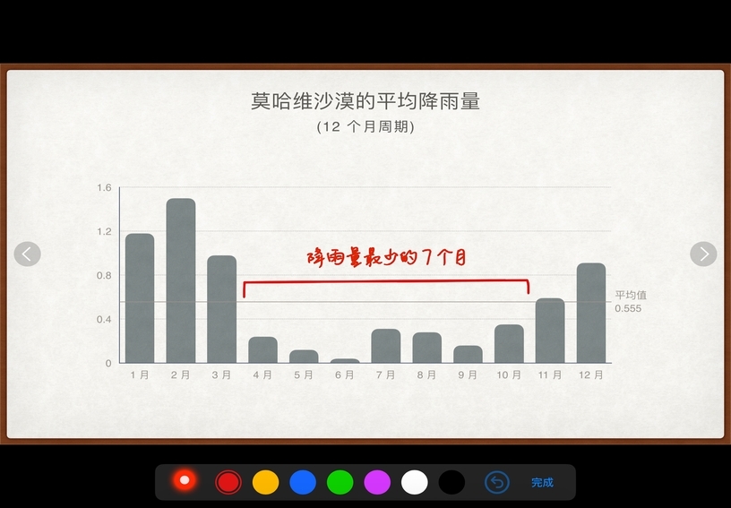 演示时在幻灯片上绘图。轻点并按住幻灯片,即可显示绘图工具。选择一种颜色,然后用手指对屏幕上图像中的重要文字或区域进行标注。
