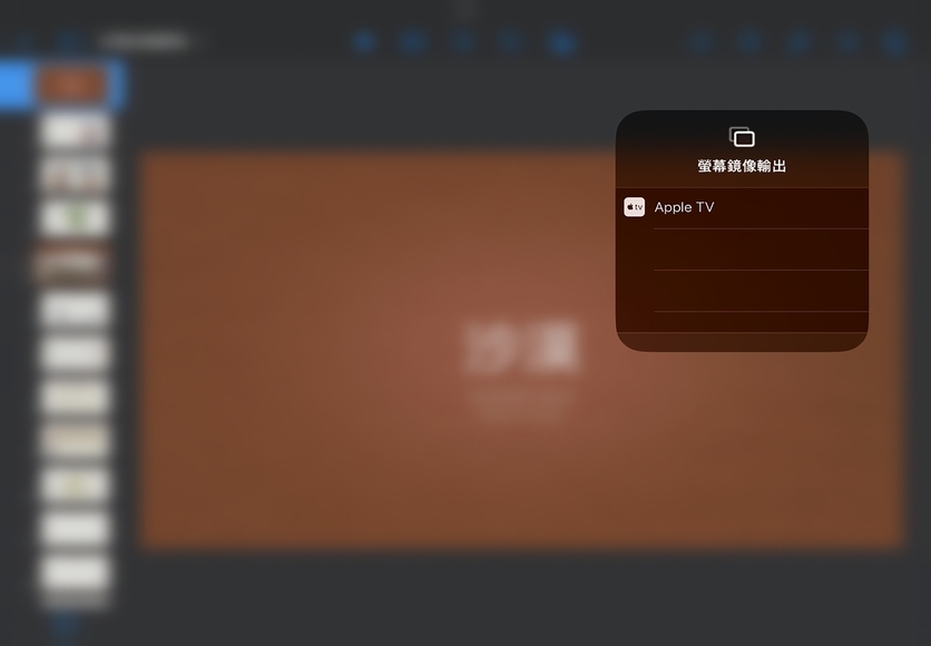若要將簡報顯示在分別獨立的螢幕上,請利用 AirPlay 將你的裝置連接到外接顯示器、投影機或 Apple TV。你的幻燈片會在連接的螢幕上播放,而你的 iPad 螢幕上會顯示發表人顯示器。