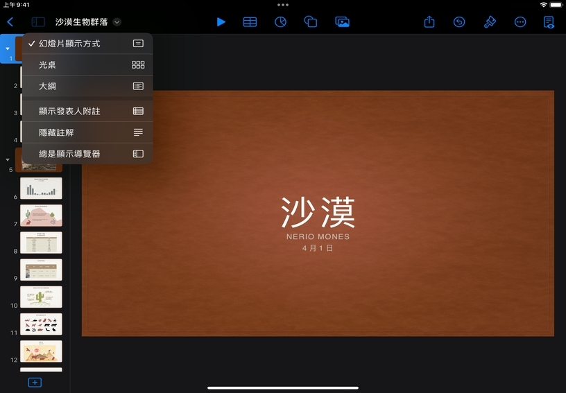 在 iPad 上發表。點一下想要開始進行簡報的那張幻燈片,然後點一下「播放」