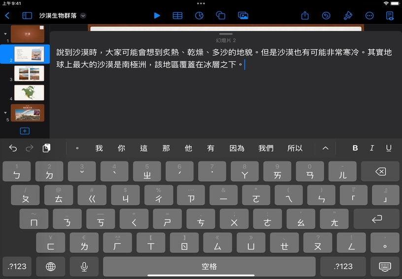 點一下幻燈片導覽器中的幻燈片,然後在幻燈片下方的發表人附註區輸入附註。完成時,點一下「隱藏鍵盤」