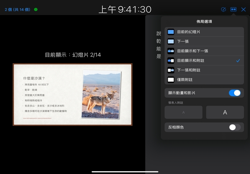 ,然後點一下「目前顯示和附註」,將目前顯示的幻燈片與發表人附註並列。點一下「關閉」