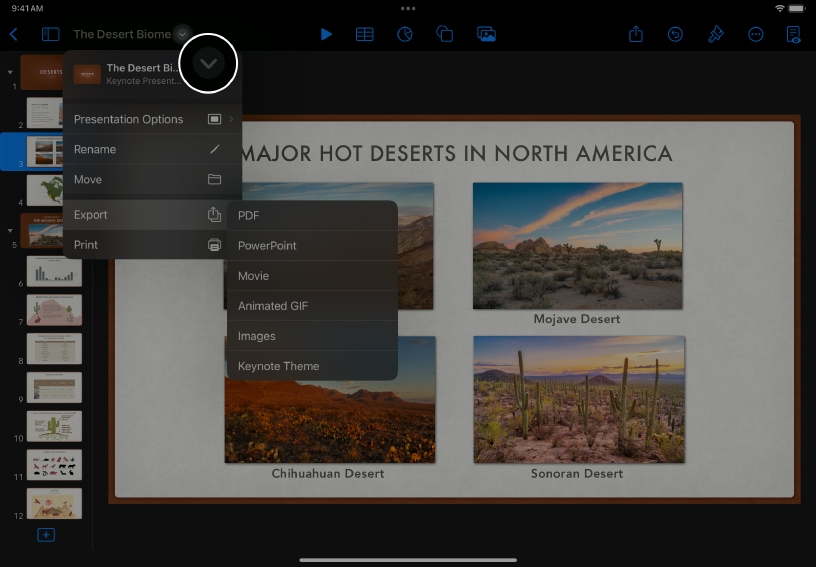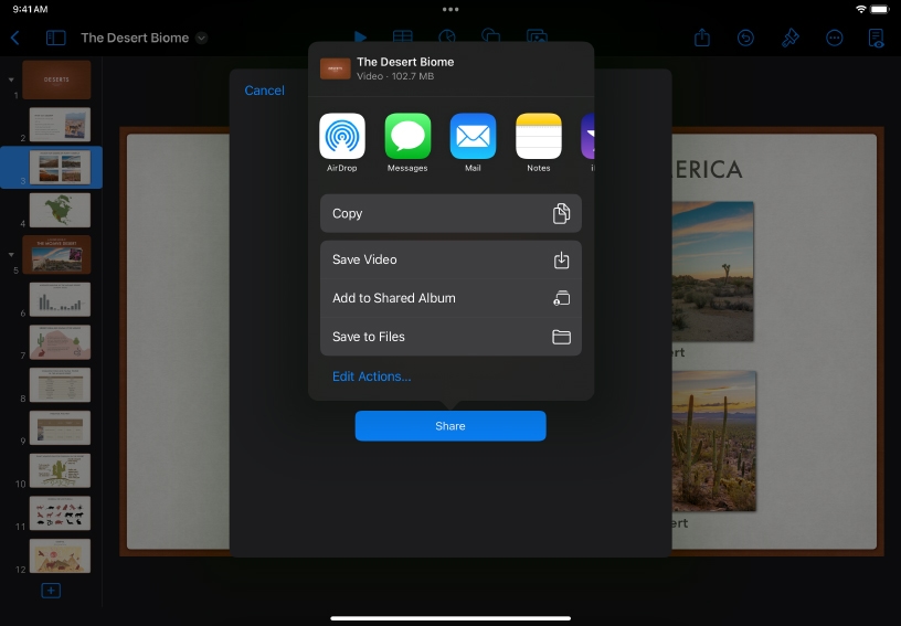 Save Keynote presentations as movies that you can post online or share directly with others. Use video presentations as instructional material for students to take home, for posting to parent newsletters and more.