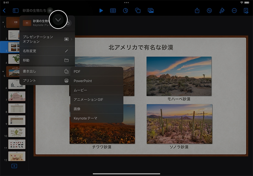 プレゼンテーションを書き出してみましょう。アクションメニューボタン>「書き出し」の順にタップし、「ムービー」を選択してください。