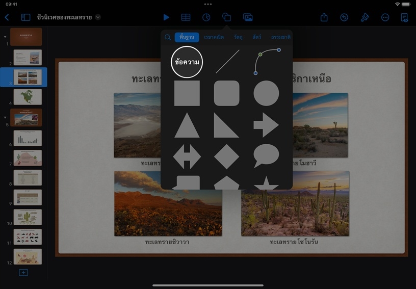 ลองแทรกข้อมูลเพิ่มเติมที่อาจช่วยให้ผู้ชมเข้าใจงานนำเสนอที่คุณแชร์ เช่น คำบรรยายภาพ โดยแตะ "รูปร่าง"