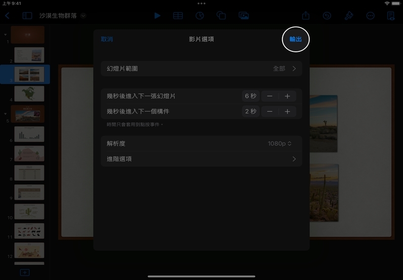 設定影片選項。你可以選擇要在影片中納入哪些幻燈片,以及每一張幻燈片在畫面上的持續時間。點一下「輸出」。