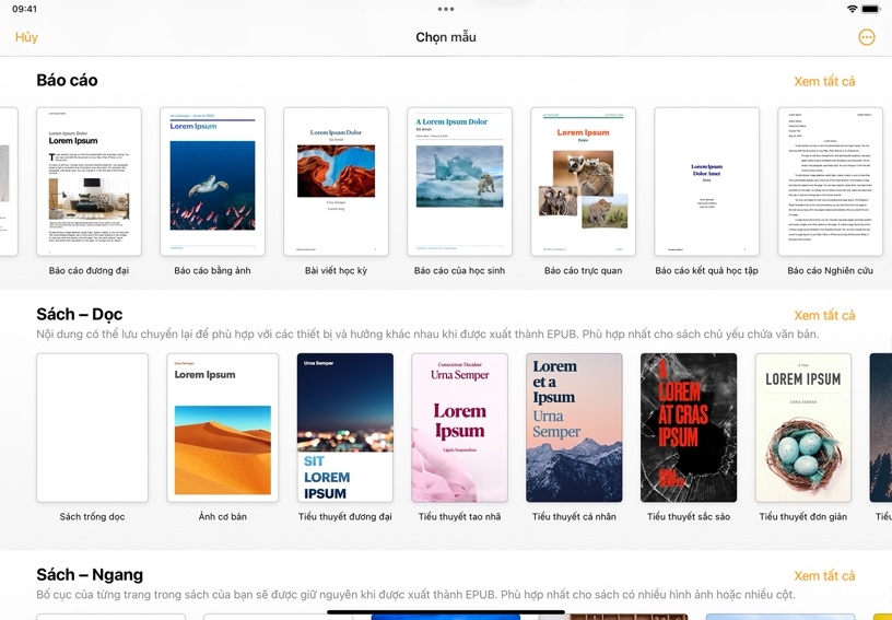 Mỗi tài liệu đều bắt đầu từ mẫu có sẵn, đó là một tổ hợp gồm các phông chữ, màu sắc và bố cục mà bạn có thể tùy chỉnh. Chọn mẫu có sẵn phù hợp nhất với tài liệu bạn muốn tạo, chẳng hạn như báo cáo, bản tin, áp phích hoặc sách.