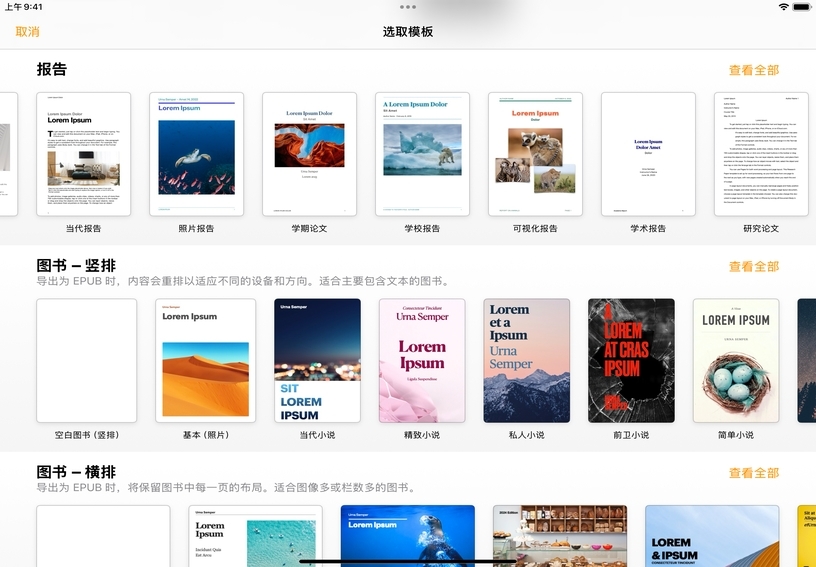 每一份文稿都是从模板 (一套精心搭配的字体、色彩和布局) 开始的,同时,你也可根据自己的喜好对模板进行各种个性化修改。为你想创建的文稿 (如报告、简报、海报或图书) 挑选最契合的模板。