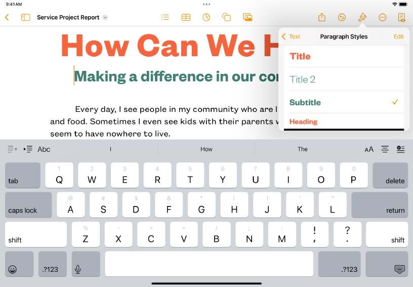 Tap the current paragraph style, then choose a new style from the menu that appears.
