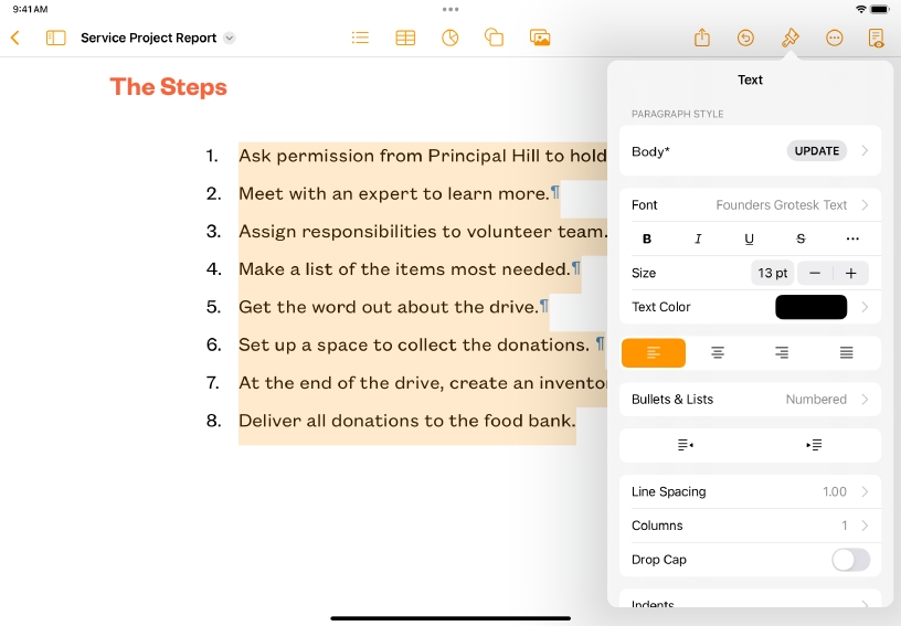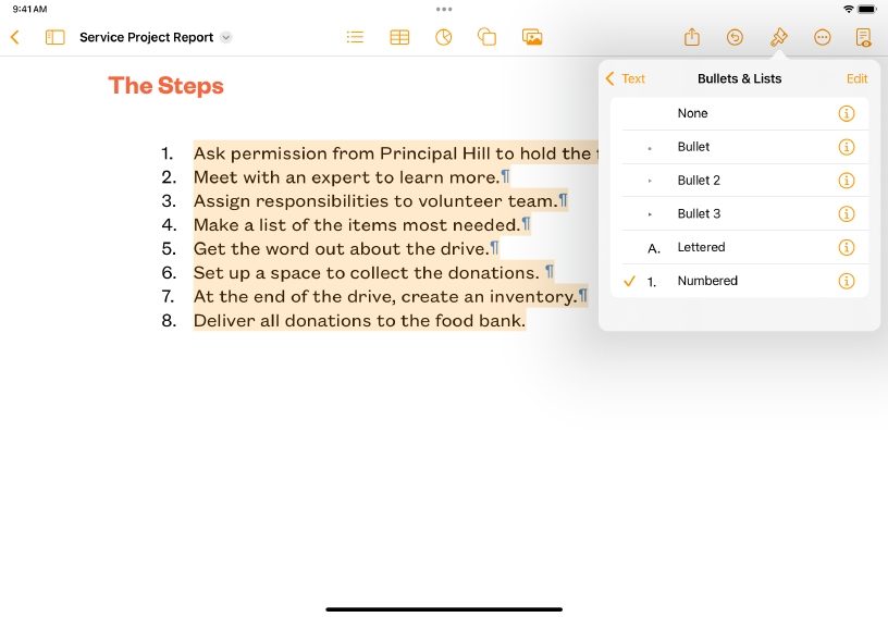 Create a list. Highlight lines of text, tap Format , then tap Bullets & Lists and choose a list style from the menu that appears.