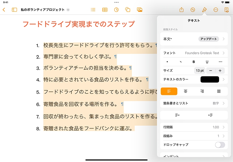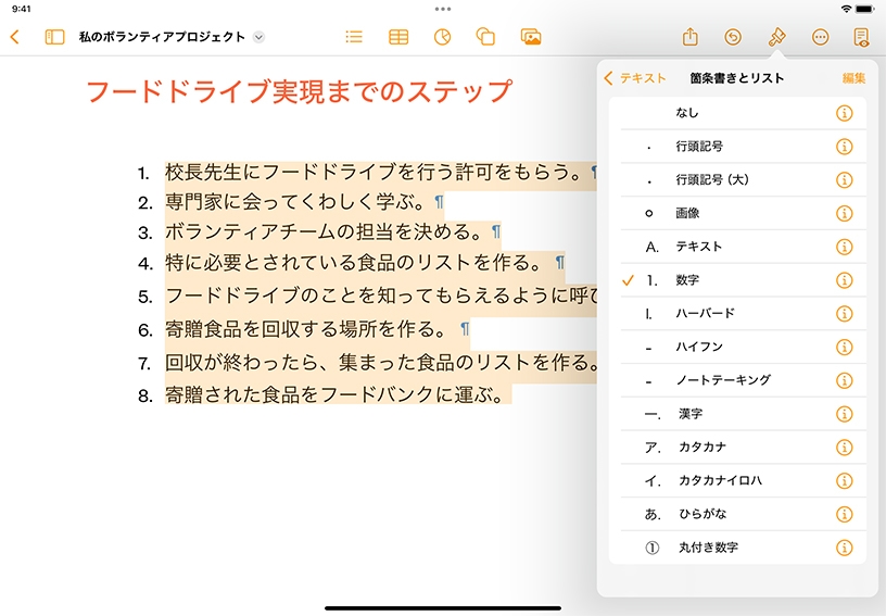 リストを作成してみましょう。複数の行にわたるテキストを選択し、フォーマットボタン >「箇条書きとリスト」の順にタップして、表示されたメニューからリストのスタイルを選択してください。