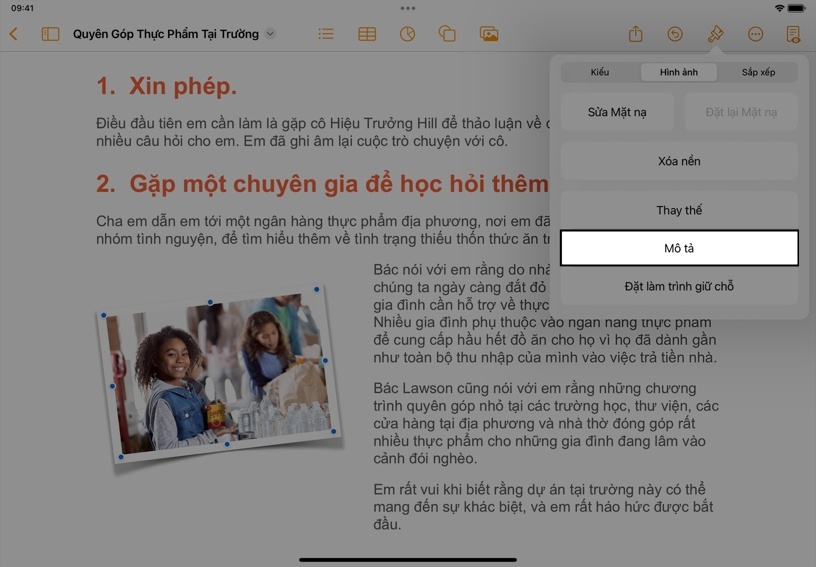 Thêm mô tả cho trợ năng. Chuyển sang thẻ Hình Ảnh, chạm vào Mô Tả, rồi nhập mô tả ngắn gọn vào hộp văn bản. Văn bản này sẽ được dùng cho công nghệ trợ năng, chẳng hạn như VoiceOver.