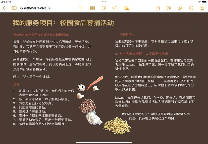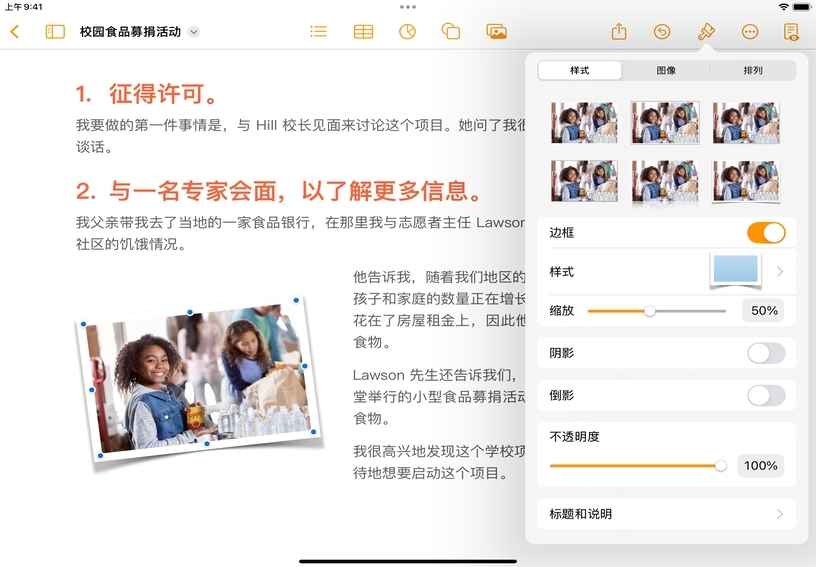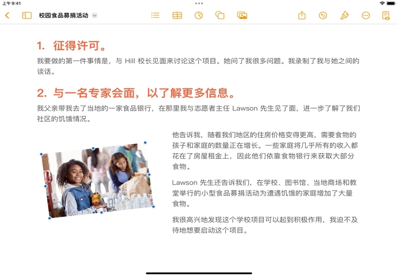 在文稿中添加照片,随心拖动至理想位置,即可见证文本如魔法般环绕照片排列。照片能够为文本增色添彩,让创意跃然眼前。
