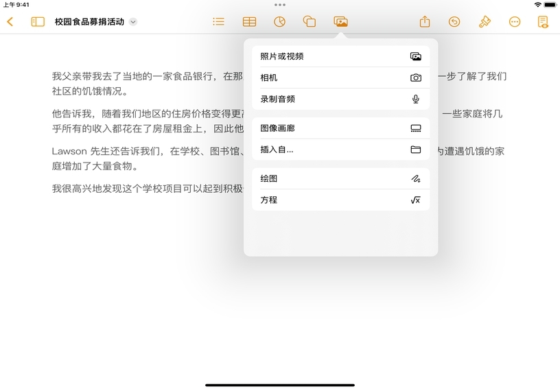 添加照片。在工具栏中,轻点“媒体”,然后轻点“照片或视频”。
