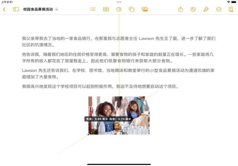 调整位置。轻点照片并拖动,即可将其移动至所需位置。在文字处理文稿中,文本会自动围绕照片进行环绕排版。
