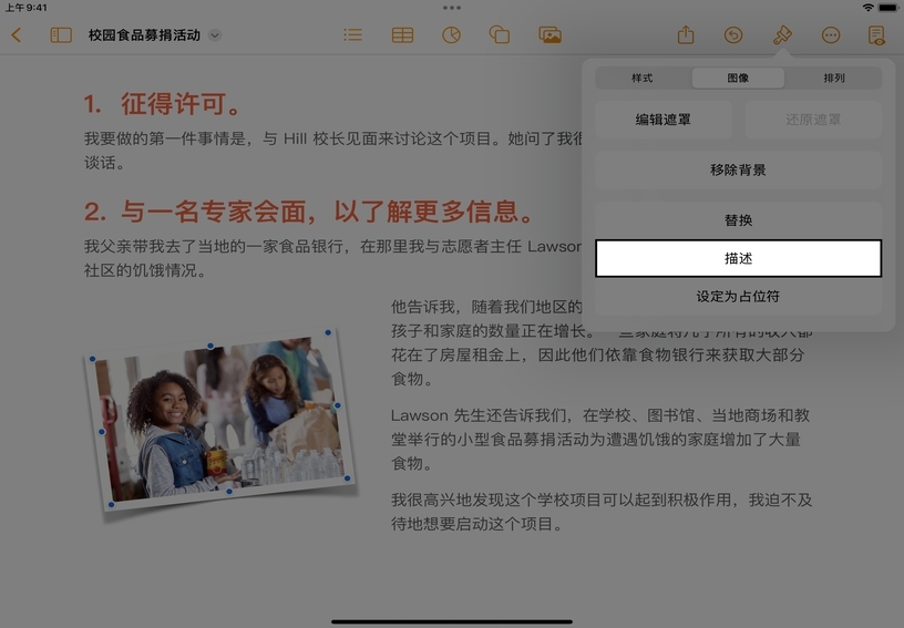 添加辅助功能描述。切换到“图像”标签页,轻点“描述”,然后在文本框中输入一段简短描述。这些描述文本将供“旁白”等辅助技术使用。