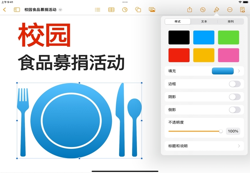 ,然后轻点“样式”。你可以从预设样式中进行选择,或轻点任意选项,通过更改颜色、边框、阴影等,以打造专属自己的外观效果。
