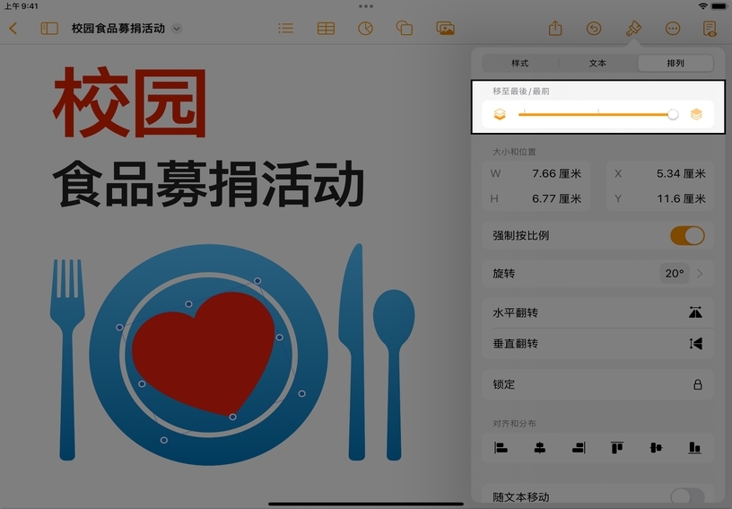 ,然后轻点“排列”。拖动“移至前面/后面”滑块,更改形状层叠方式。