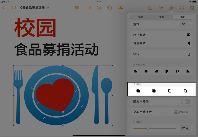 合并形状。轻触并按住第一个形状,然后轻点第二个形状,以选中这两个形状。轻点“格式”