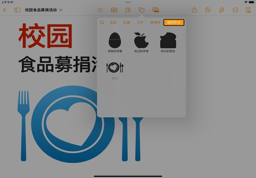 查找自定形状。在形状库中,轻点“我的形状”类别,即可查找和使用你创建的任何形状。