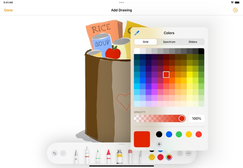 Change colours. Tap one of the preset colour dots to switch the colour of the currently selected tool, or tap the colour wheel to choose a custom colour from the palette.
