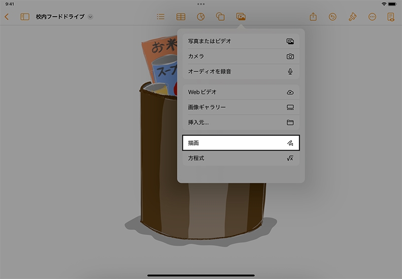 指でスケッチしてみましょう。メディアボタン>「描画」の順にタップしてください。