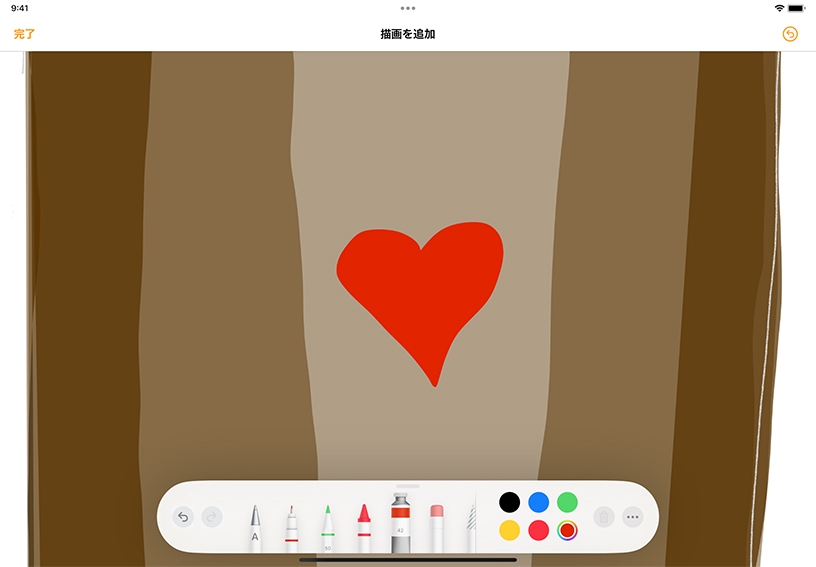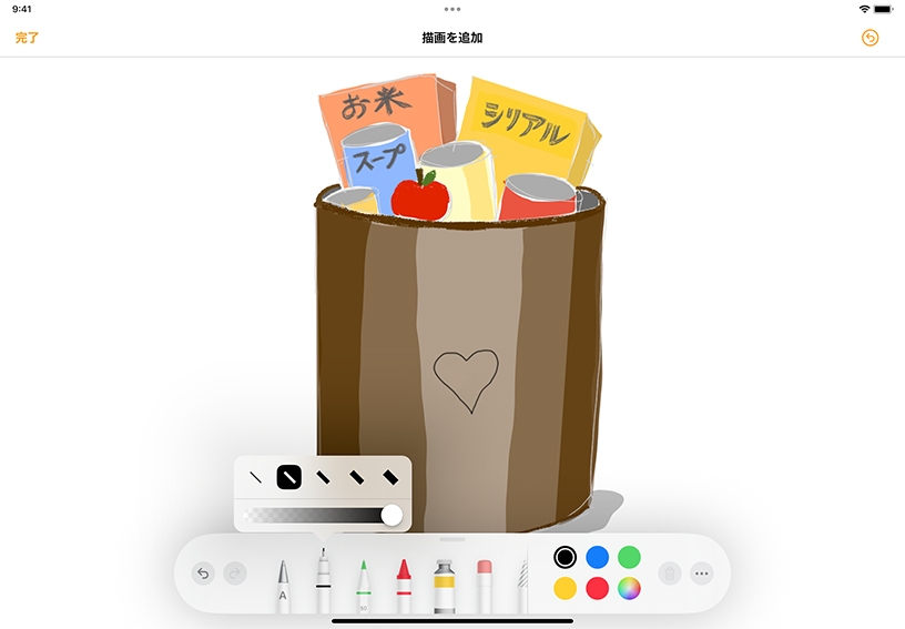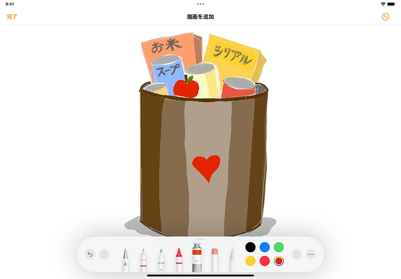 内蔵のツールを使って、Apple Pencilや指で描いたスケッチ、落書き風イラスト、手書きの文字を追加できます。描画機能を使って書類に自分らしさを加えたり、スケッチノート、マンガ、絵日記を作成したりしてみましょう。