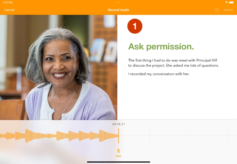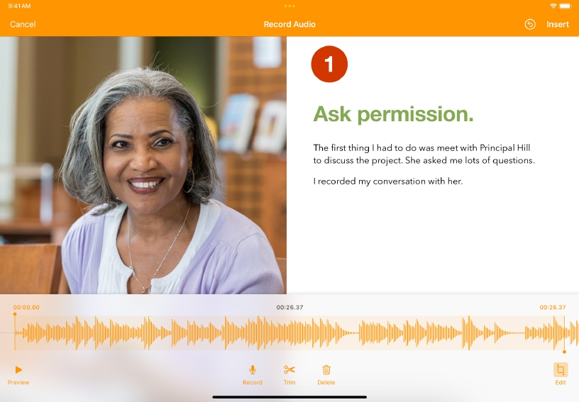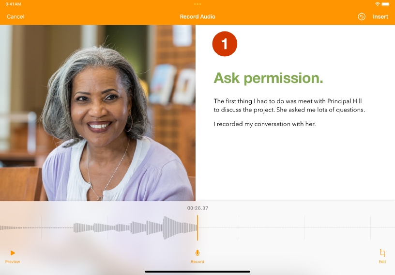 Use audio to reinforce a set of instructions. Record and edit audio for each step of a process.