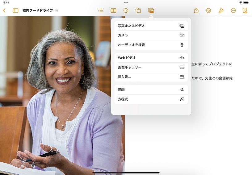 GarageBandなどのアプリで作成したオーディオを追加して、ドキュメントをさらに魅力的にできます。ストーリーにサウンドトラックを添えたり、ビートにのせて詩を紹介したり。外国語の授業では、現地の音楽を生徒たちに聴いてもらうこともできます。