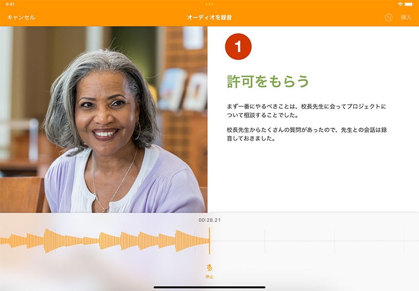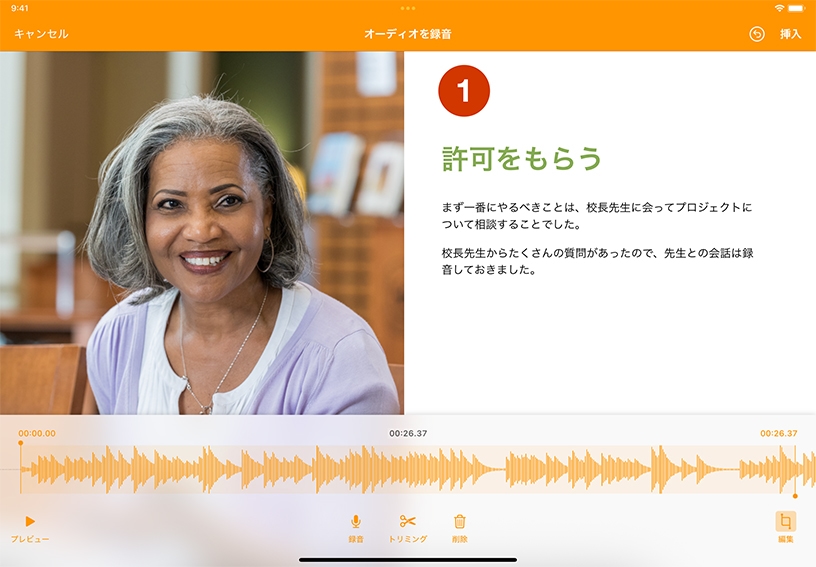 音声を使って、一連のステップをわかりやすく伝えてみましょう。ステップごとに説明を録音し、編集してみてください。