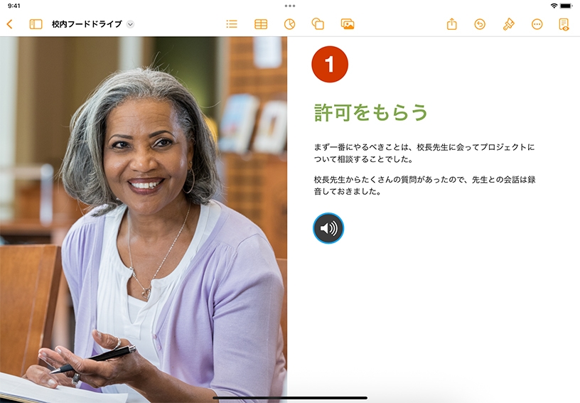 iPadに内蔵されているマイクを使って音声を録音し、あらゆるページに直接追加できます。低学年の生徒たちの理解を助けるために文学作品にナレーションを付けたり、補足の説明やコメントを入れたり、物語に音楽や効果音を付けたりしてみましょう。