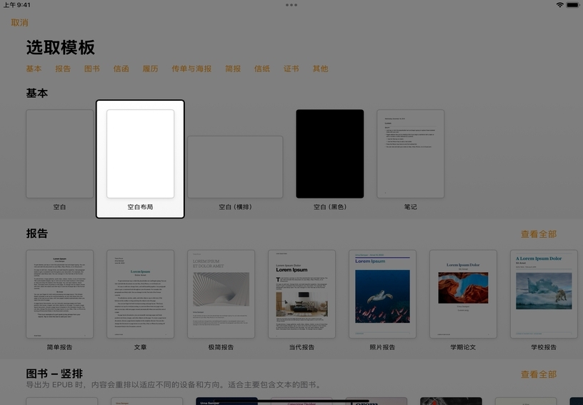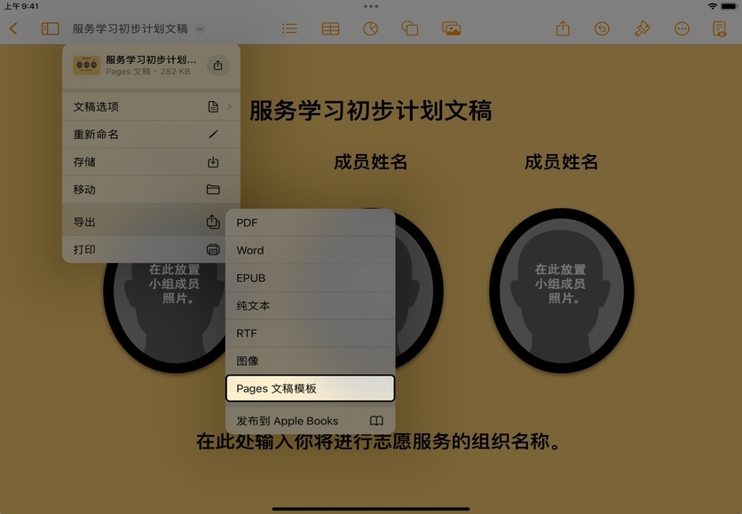 在 Pages 文稿中完成布局的自定设计后,可将其存储为自定模板,以便在后续项目中直接使用,或分享给其他有需要的人。你的自定模板可通过 iCloud 在所有设备上同步;因此,你可以在 iPad 上创建模板,之后在 Mac 上继续使用;反之,在 Mac 上创建的模板也能在 iPad 上使用。