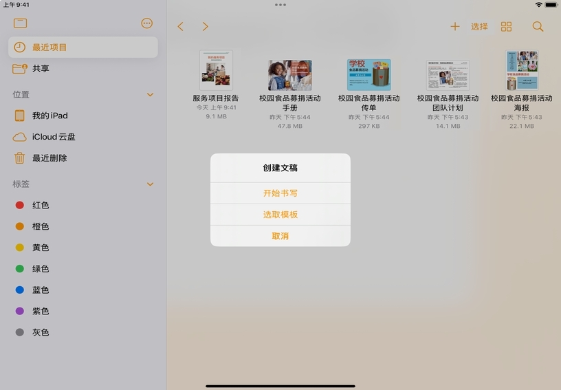 创建新的空白文稿。轻点文稿管理器中的“创建文稿”